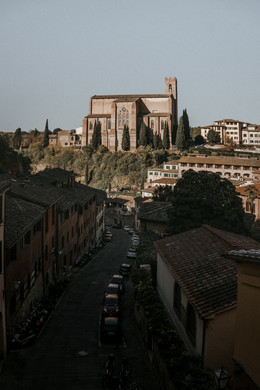 Le deuxième point de vue que j'ai rencontré lors de la descente des marches de la cathédrale de Sienne est celui situé au centre de la rue Via di Diacceto, à même pas une minute de marche. D'ici, la vue nous plonge une rue qui mène à une basilique, sur plusieurs cyprès, l'arbre typique de la Toscane, et sur plusieurs belles demeures des habitants.